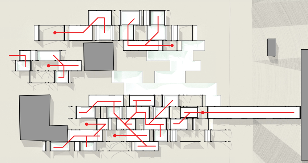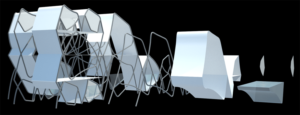A bathhouse designed as part of an urban plan to revitalize a run-down part of Philadelphia. This building seeks to occupy the open space on the site while navigating within the existing buildings and infrastructure. Derived from a mapping of the existing streetscape, the structures infill the site as ribbons that weave the urban fabric together. The building strives to intermingle public and private by gradually collapsing spaces into each other. Large open structures define large public spaces that overlap with smaller private spaces. The result is a gradient of public and private spaces that fill the site as a field condition. The bathhouse follows this pattern by providing large public bathing areas that gradually connect into smaller individual pools for smaller groups.